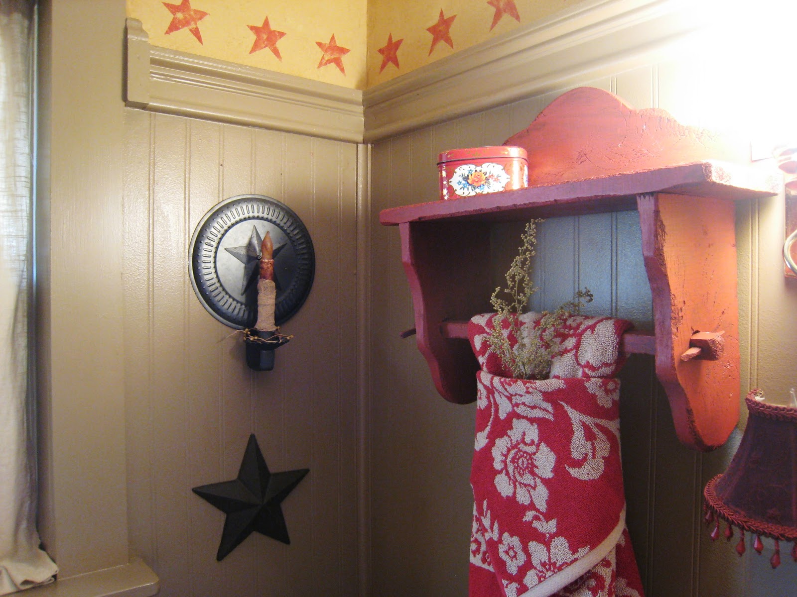 Walmart towel with a sprig of Sweet Annie tucked in, old shelf from an antique mall, it was blue but I added some red paint.
